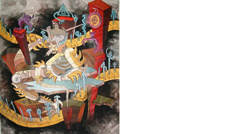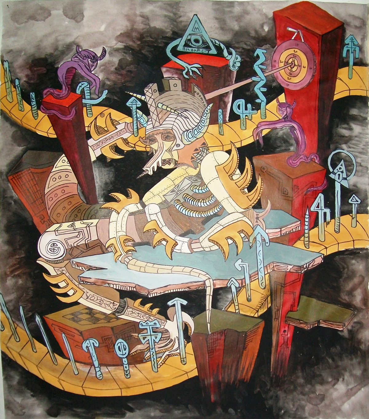The upcoming visual artist, Thanos Panagiotou, “induces” a psychedelic experience in his paintings where Tantric unities unfold in an unearthly cosmic universe. Hybrid robots and biomorphic creatures sexually engage with anthropomorphic figures of fluid mass in these complex compositions. The outcome has very little in line with the current Greek visual art movements. It is an unexpected, exciting and deeply underground (whatever this means today) work. According to the artist, different painting techniques are used on the same surface giving multiple layers coming from a bizarre reality, using either a more painterly or linear approach.
