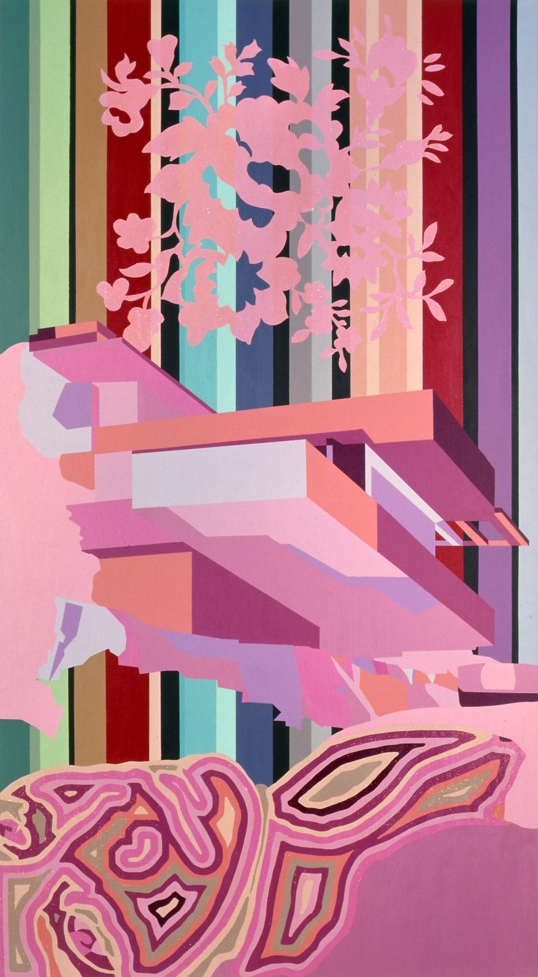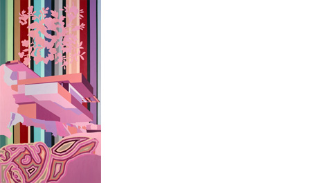 ...In George Kazazi's painting the domestic supremacy of Kauffmann's popular Fallingwater, which bears Frank Lloyd Wright's signature is juxtaposed with an expressionless reclining female body outside the protective borders of home. The alienating self-complacency of the famous house is in contrast with the pathogenic atmosphere of public life. In a way, it seems like one state is a precondition for the other...