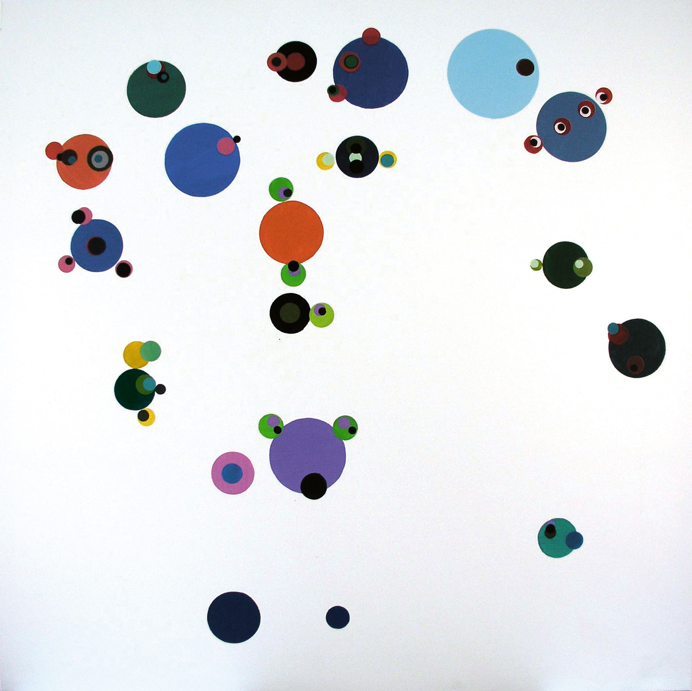 A sense of movement, with patterns of overlapping circles.  Circles are painted by hand, in saturated colours, shaping   almost representational forms of constellations or cartoons. A pale grey background serves as an empty space into which the figures are floating .The result is mocking a printed surface, implying a joke on the artist’s relation with technology.