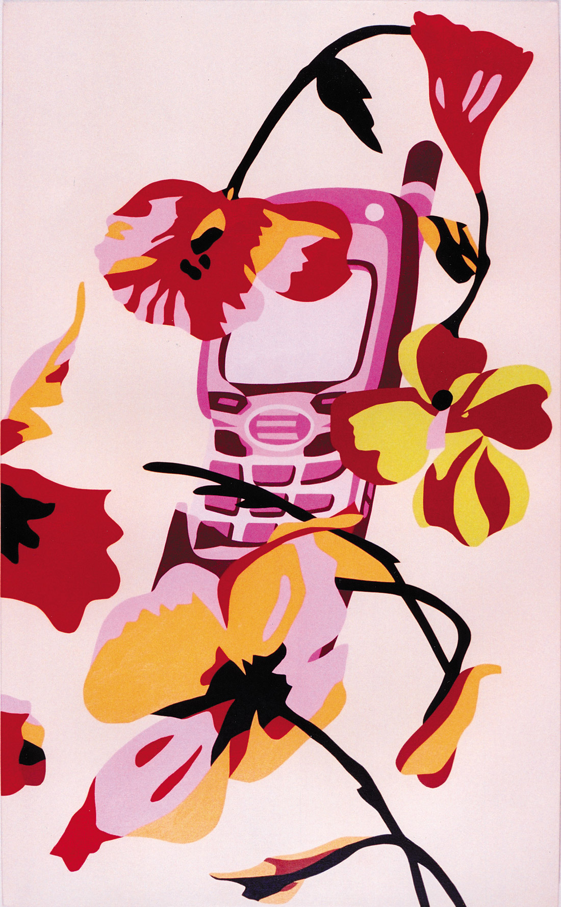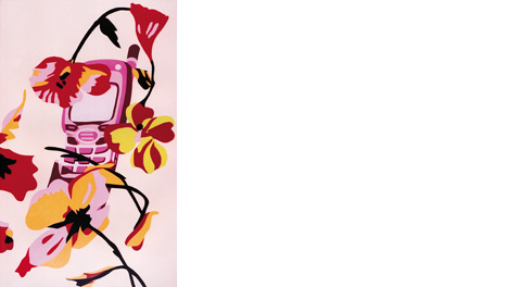 Projected and computer-manipulated images, sleekly transferred into acrylic paint, lie at the basis of these psychedelic concoctions. They were at first taken out from contemporary life, lifted from glossy magazines or the Internet. Often they are still recognizable - figures, forks and knifes - sometimes they have been fragmented and rearranged into repetitive patterns. The resulting canvases capture the mood, the energy and the psyche of the bright side of our contemporary lives, without pretense, without regrets.