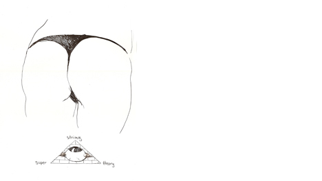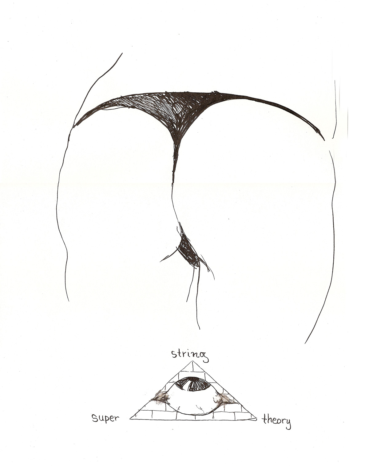 In general, the drawing is created by thin, elegant ink lines. Nevertheless, the thick dark form of the string underwear is dominant, pointed out as a pun to the Super String cosmological theory.