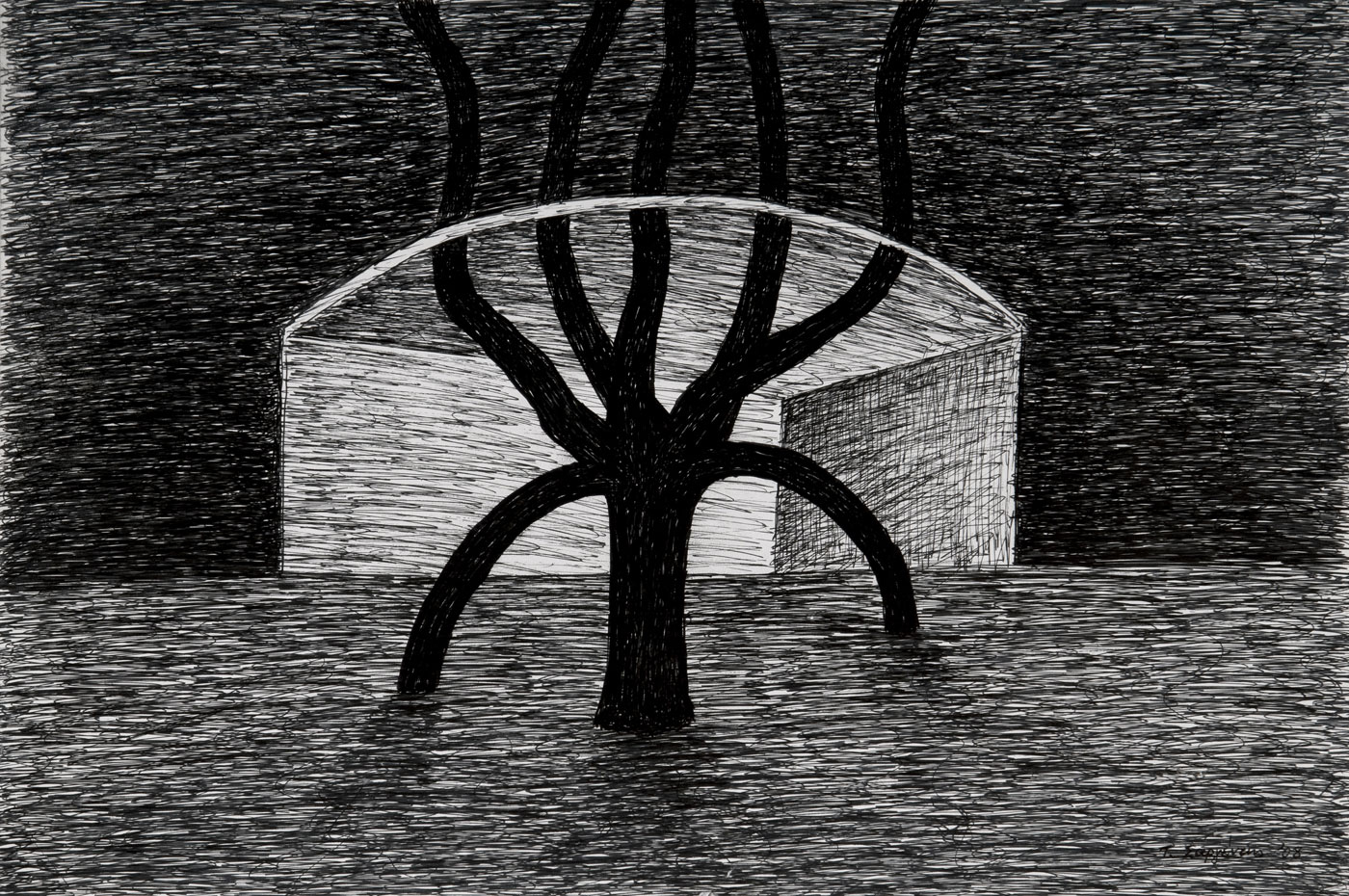 Every drawing of the artist is a structural re-edit of the blank of the tree (figure) and an anew mental process of relationships of the figures, based on a potential, mutated logic. The tree puts, in fact, its roots on three levels: sea-earth-sky. Every change in this path of the roots subverts the notion and the symbolism of the tree. At the same time, the random ramifications of the branches when they happen arbitrarily, they often lead to oddities.