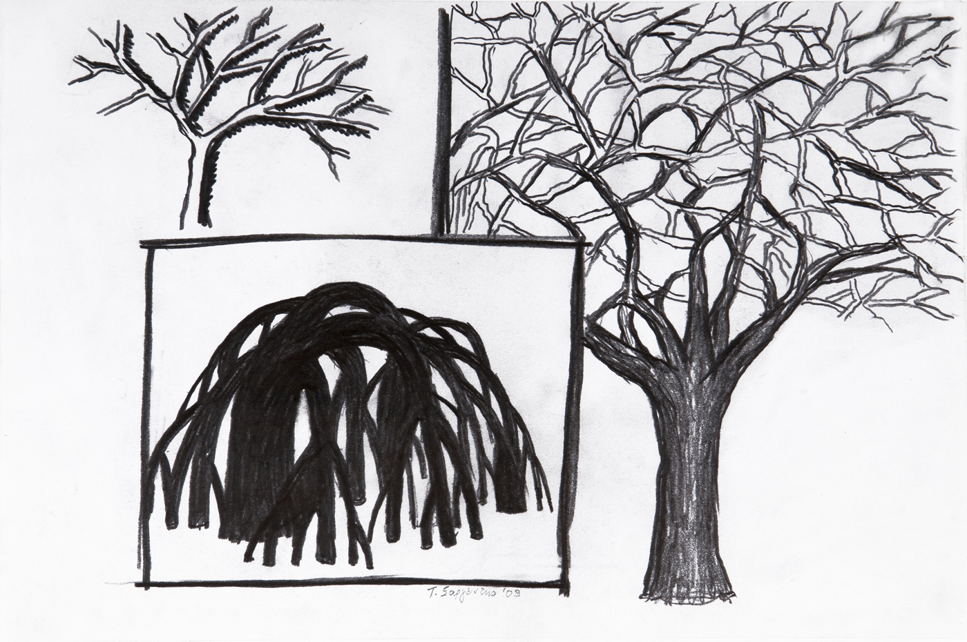Every drawing of the artist is a structural re-edit of the blank of the tree (figure) and an anew mental process of relationships of the figures, based on a potential, mutated logic. The tree puts, in fact, its roots on three levels: sea-earth-sky. Every change in this path of the roots subverts the notion and the symbolism of the tree. At the same time, the random ramifications of the branches when they happen arbitrarily, they often lead to oddities.